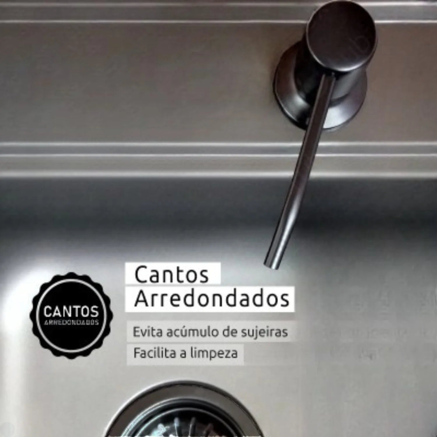 Conforto extra: o local específico para o dispenser de detergente ajuda a manter sua pia organizada e funcional. O sistema antirruído, presente no fundo da cuba, minimiza o ruído do fluxo de água, tornando o uso ainda mais agradável.