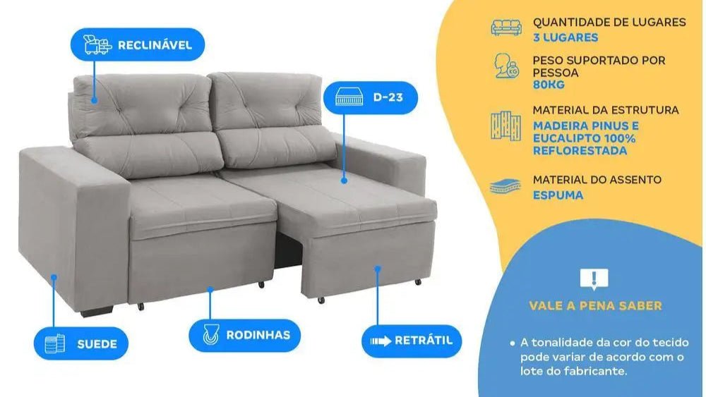 Este sofá de 3 lugares é retrátil e reclinável, ideal para quem gosta de conforto nas suas horas de lazer. Isso sem falar que é super confortável com revestimento de camurça e acabamento pena. O que garante a beleza e qualidade do produto.E tem mais, sua estrutura de madeira pinus e eucalipto é 100% reflorestada.