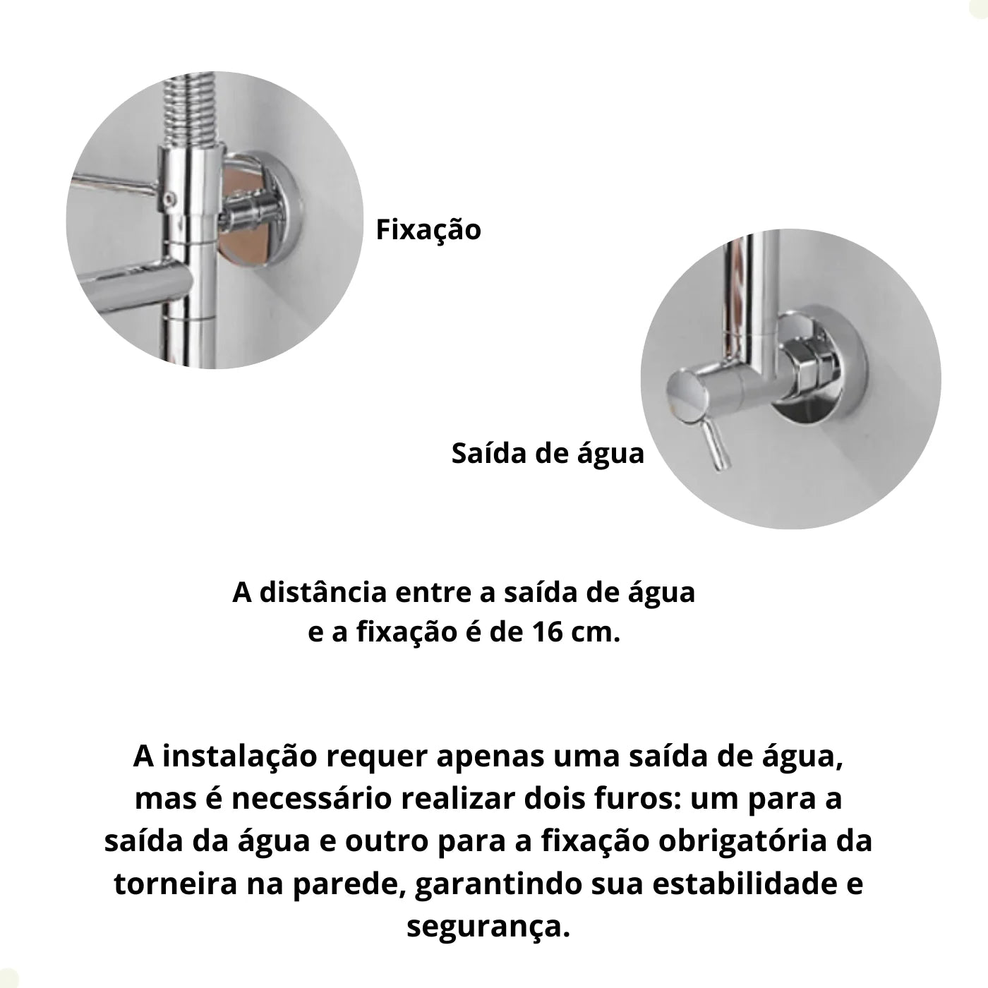 Instalação: Os acessórios necessários para sua fixação encontram-se dentro da embalagem. IMPORTANTE: Você precisa apenas de 1 saída de água, mas precisa de 2 furos, 1 para saída de água e outro para fixação da torneira na parede (FIXAÇÃO OBRIGATÓRIA).