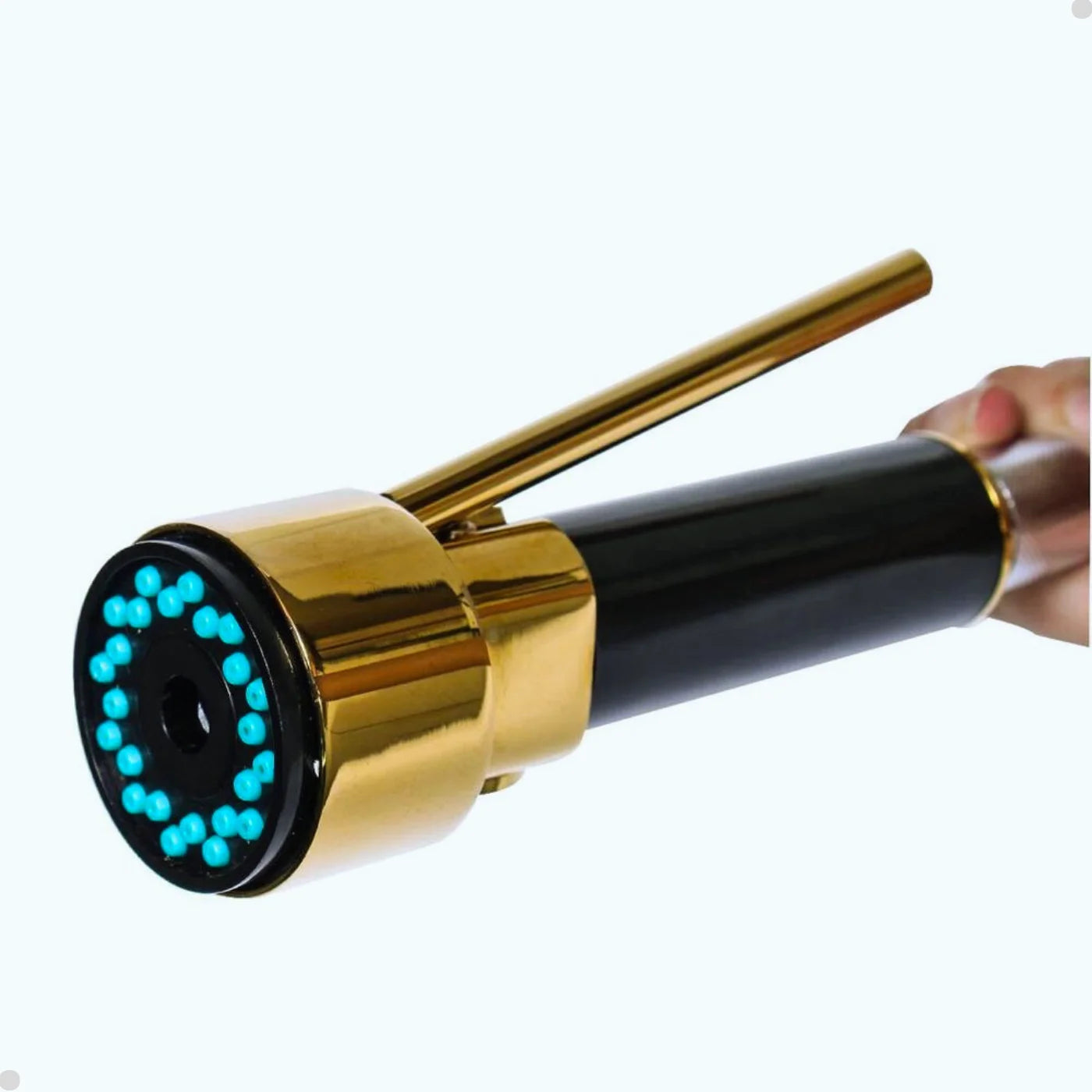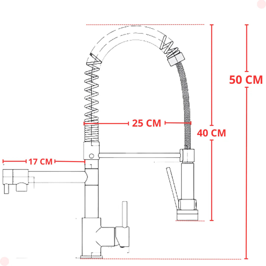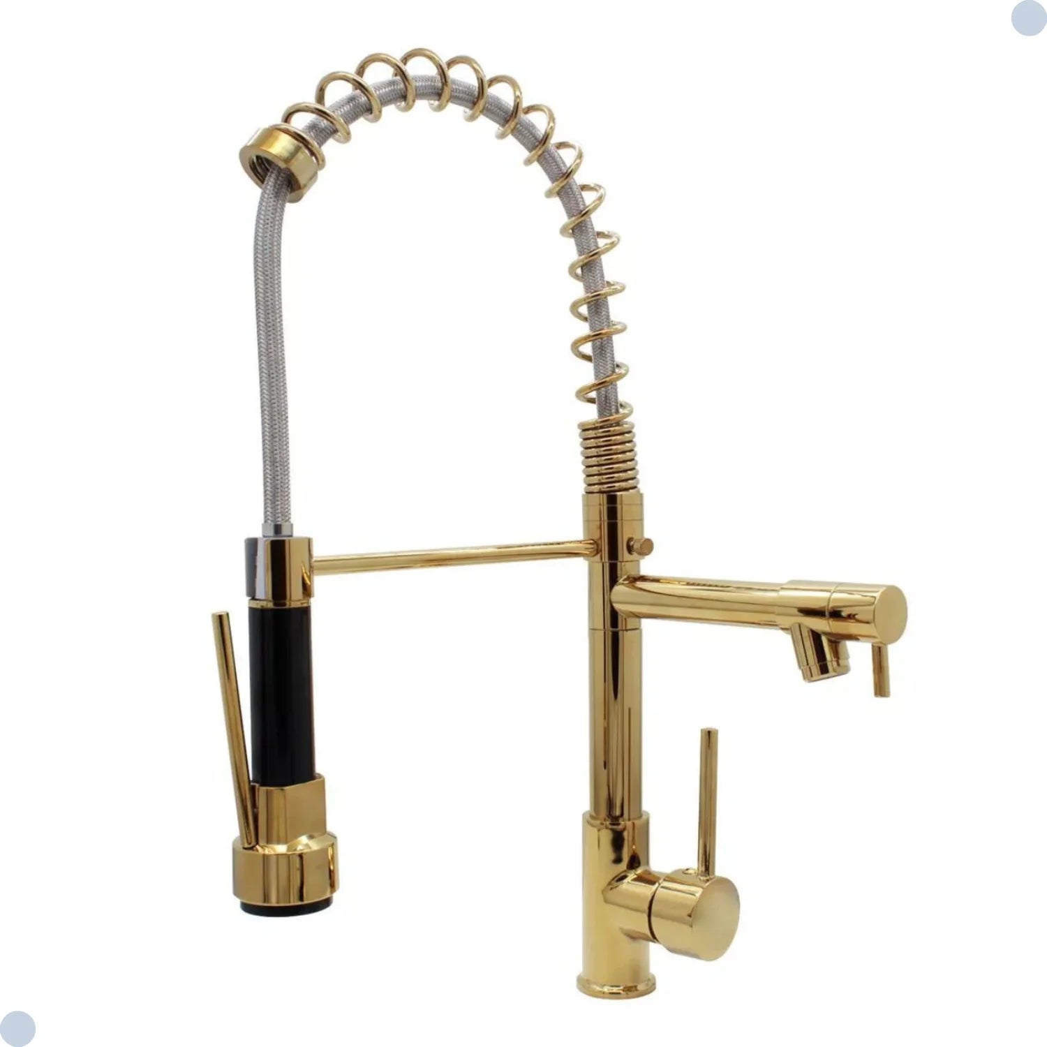 Torneira gourmet de design moderno e robusto, projetada para uso em cozinhas domésticas ou industriais. Esta torneira possui duas saídas de água, sendo uma flexível com jato e outra rotativa, que podem operar paralelamente ou separadamente, permitindo assim a lavagem de alimentos e utensílios de forma mais prática e controlada.
