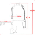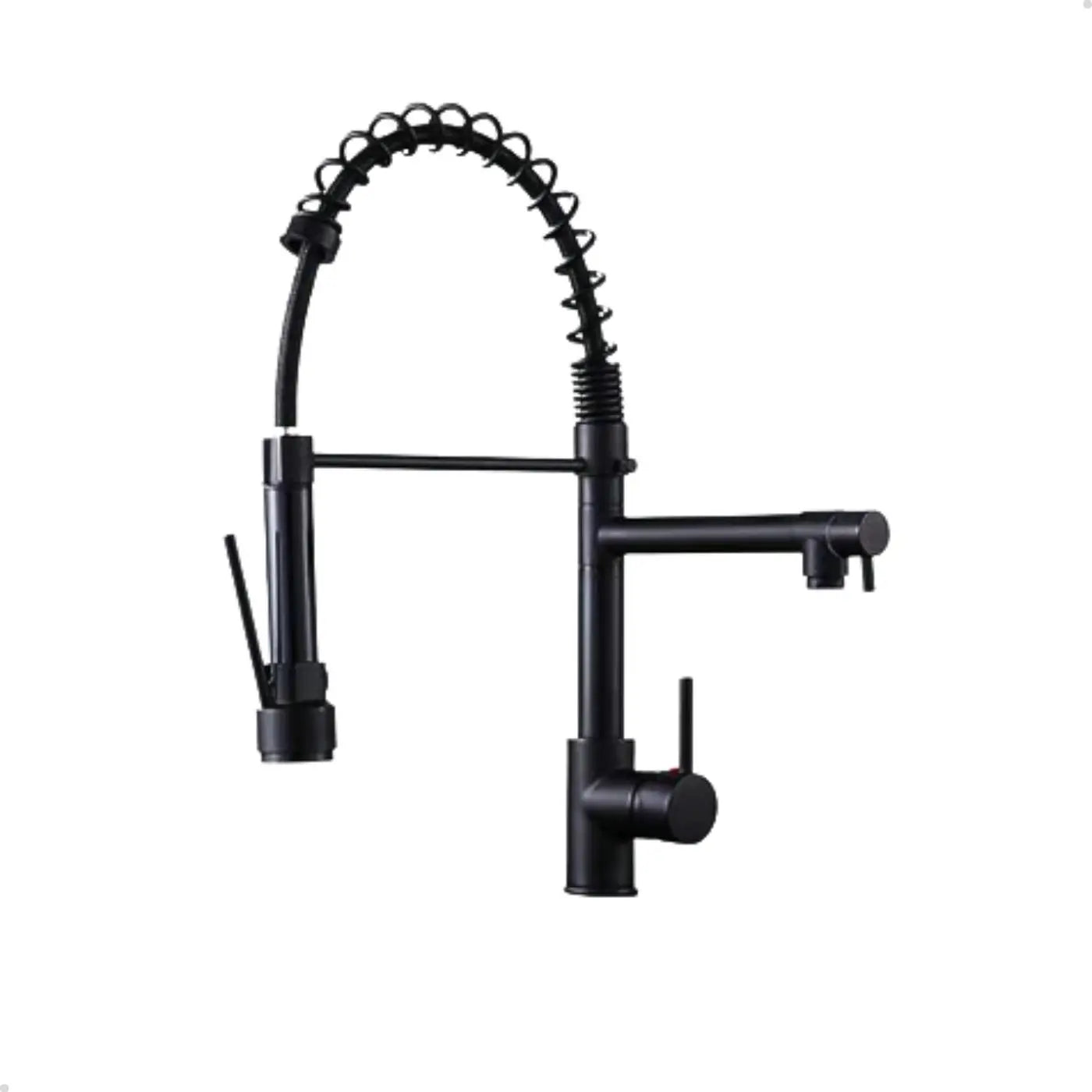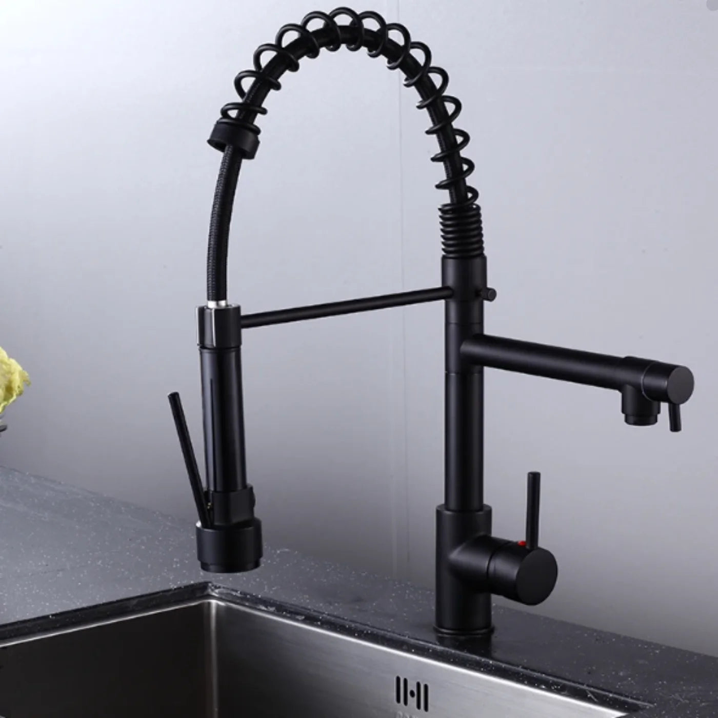 Torneira gourmet de design moderno e robusto, projetada para uso em cozinhas domésticas ou industriais. Esta torneira possui duas saídas de água, sendo uma flexível com jato e outra giratória, que podem operar paralelas ou separadamente, permitindo assim a lavagem de alimentos e utensílios de forma mais prática e controlada.